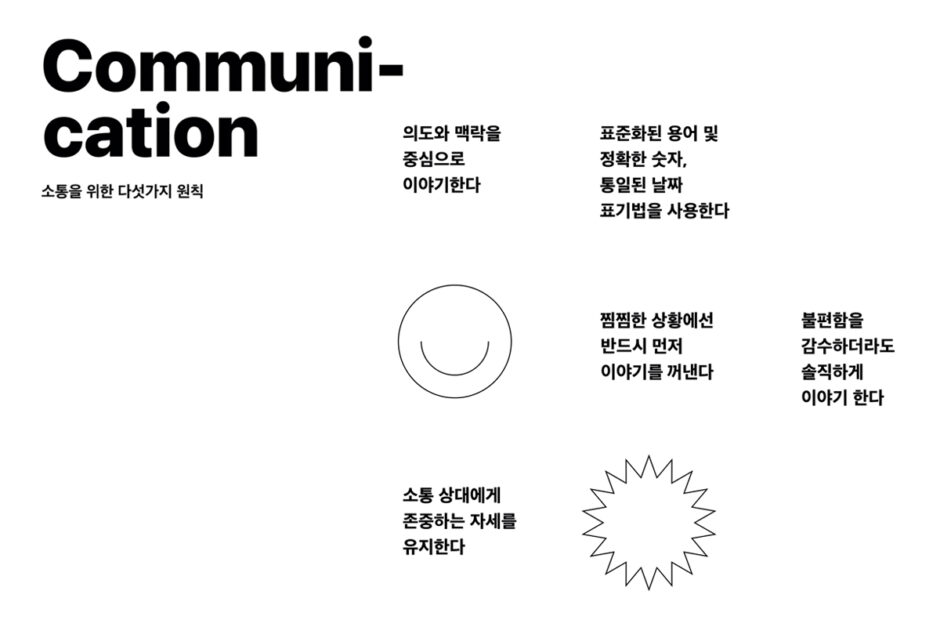 좋은 소통은 업무 속도를 높이고 팀 간 신뢰를 만듭니다. 리디는 ‘미스 커뮤니케이션’을 경계합니다. 이를 위해 명확한 의도와 맥락을 담아 표준화된 용어를 사용합니다. 찜찜한 상황이 없도록 정보를 투명하게 공유하고 동료를 동등한 파트너로 존중하면서 협업의 질이 높여갑니다.
