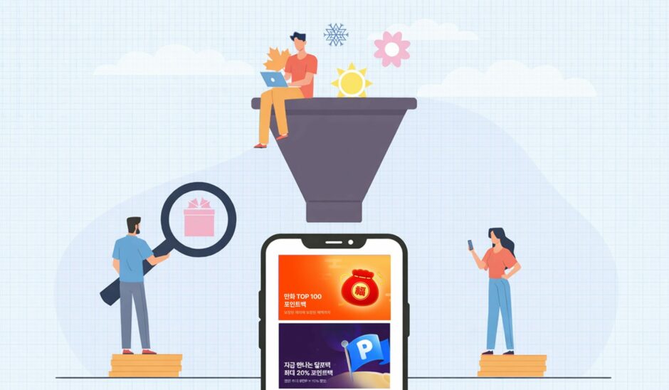 웹툰은 이동 중이나 자투리 시간에 가볍게 소비되는 특성을 고려해 ‘100원 장터’ 컨셉의 큐레이션을 구성했습니다. 낮은 가격으로 진입 장벽을 줄이고 짧은 시간 안에 즐길 수 있는 작품을 전면에 배치합니다.