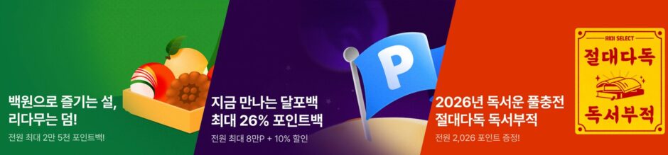 웹소설은 연휴의 긴 시간을 활용해 정주행하는 독자를 타깃으로 합니다. 할인과 포인트 혜택을 함께 제안해 긴 호흡의 이야기에 부담 없이 빠져들 수 있는 환경을 만듭니다.