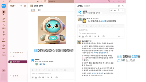 또한 Notion에 정리된 전사 가이드 및 매뉴얼에 대한 반복적인 문의를 해결하기 위해 헬프데스크 자동화 봇 ‘BWS Bot’을 개발해 구성원들이 Slack에서 직접 질문하면 즉시 답변을 제공하도록 했습니다. 반복적으로 문의되던 질문을 대부분 이 봇이 처리하면서 리드타임이 단축돼 IT팀의 운영 생산성이 크게 향상됐고, 구성원은 더 빠르게 문제를 해결할 수 있는 환경이 마련되었습니다.